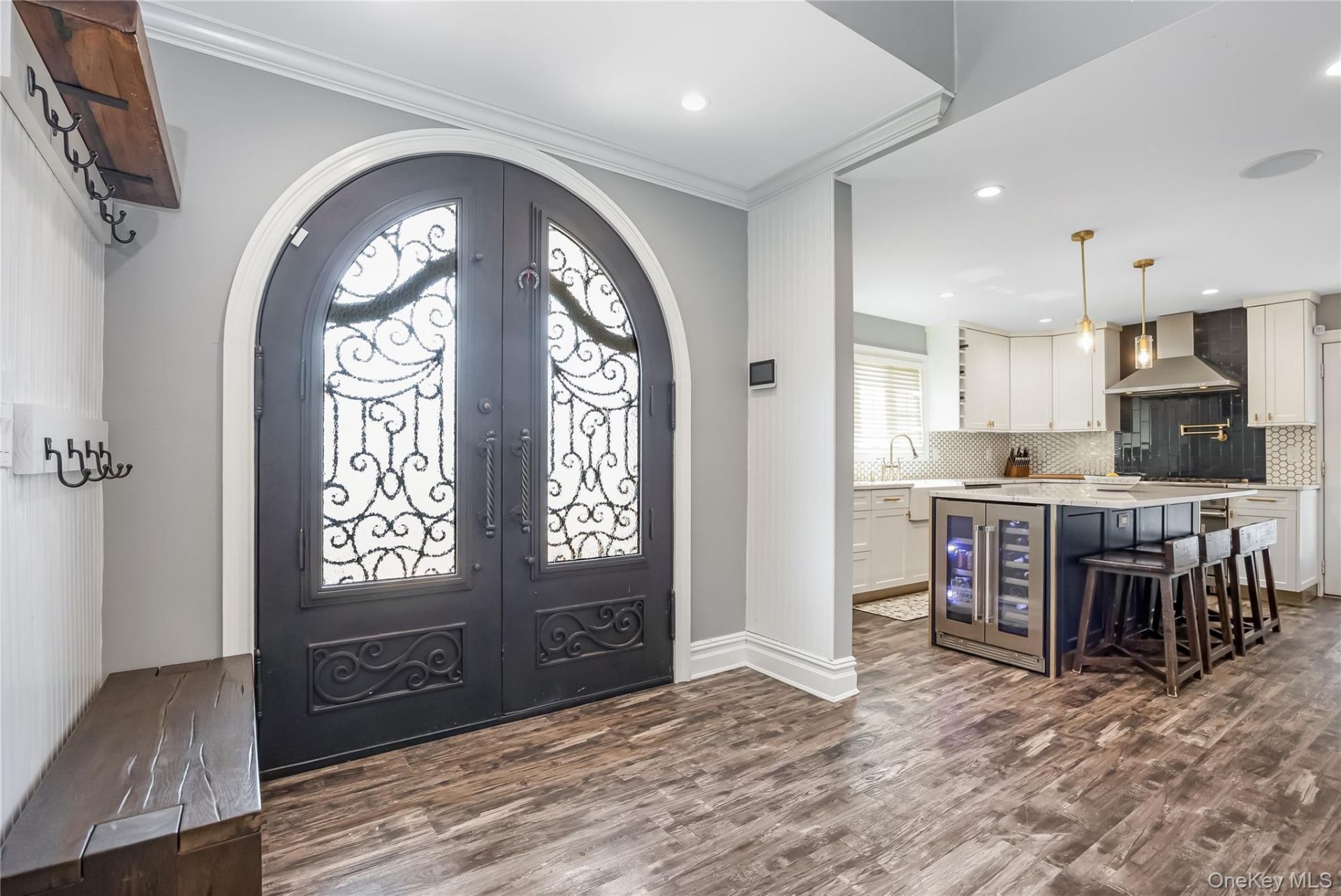 Exceptional fully renovated 5-bedroom, 3-bath residence blending modern luxury with thoughtful design. A grand entry with soaring 20-foot ceilings introduces a beautifully updated interior, the result of a complete 2022 renovation. The custom chef's kitchen is outfitted with a farmhouse sink, double-wide beverage refrigerator, coffee station, 6-burner Viking gas range with pot filler, and full-size refrigerator and stand-up freezer. Upstairs offers four bedrooms, a full bath with jacuzzi tub, and a spacious primary suite featuring a large walk-in closet, soaking tub, and oversized double walk-in shower, plus walk-in attic storage. The lower level features an oversized den, full bath, large laundry room with new washer and dryer, and an entertainer's bar with beverage refrigerator and summer kitchen. Additional highlights include updated 200-amp electric, two tankless water heaters, and a Denon sound system. Set on a fully paved 70x100 lot, the outdoor space is designed for entertaining with all-new pavers, a fully equipped outdoor kitchen with gas grill, sink, refrigerator, and bar seating, and a heated semi-inground saltwater pool with sun deck. UniFi security system included. Includes access to Dolphin Beach.